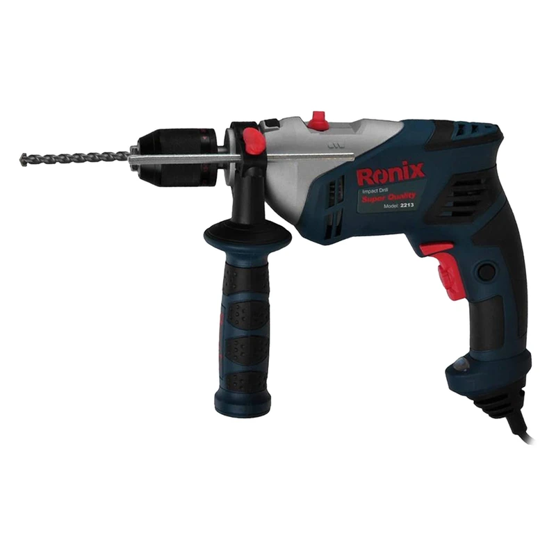 دریل 2213 از سری دریلهای چکشی ساخت شرکت «رونیکس» (Ronix) است. این دریل توانی معادل 650 وات دارد و همانطور که گفته شد از قابلیت چکشی برخوردار است. یعنی برای سوراخکاری روی سطوح ساختمانی سخت مانند سیمان با استفاده از قابلیت چکشی یا ضربهای راحتتر میتوان این کار را انجام داد. سرعت گردش موتور این دریل در حالت آزاد 3000 دور بر دقیقه است که این سرعت برای یک دریل خانگی مناسب است. همچنین از قابلیت گردش به دو جهت چپ و راست برخوردار است که این ویژگی با کمک دکمه قرار گرفته دربالای کلید روشن و خاموش قابل تظیم است. حداکثر قطر سوراخکاری با این دریل در سطوح چوبی 13 میلیمتر و در سطوح فلزی و مصالح ساختمانی هم 13 میلیمتر است. طول کابل در نظر گرفته شده برای این دریل سه متر است. گفتنیست همراه این دریل یک عدد کیف حمل و یک دسته کمکی هم ارائه میشود.