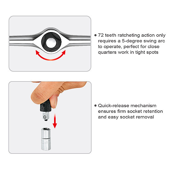 ویژگی های فنی آچار دسته تی جغجغه دار خلاص کن اتومات 1/4 تاپ تول مدل CTRM0826