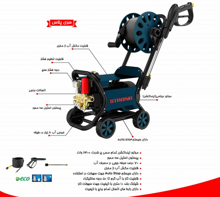 کارواش دینامی 180 بار 2400 وات استرانگ مدل KAW180 Plus از سری پلاس کارواش های حرفه ای و پر قدرت شرکت استرانگ میباشد، این کارواش با برق 220 ولت کار میکند و قابلیت کار با آب گرم تا دمای 50 درجه را دارا میباشد. این کارواش قابلیت کنترل فشار آب خروجی (فشار شکن) را دارا میباشد که برای کنترل میزان خروجی آب متناسب با نیاز هر فرد قابل تنظیم است. این کارواش دارای کلت و لانس دوحالته با قابلیت کوتاه و بلند شدن جهت شرایط خاص و شیلنگ منجید دار 10 متری همراه با جمع کن شیلنگ نیز میباشد.