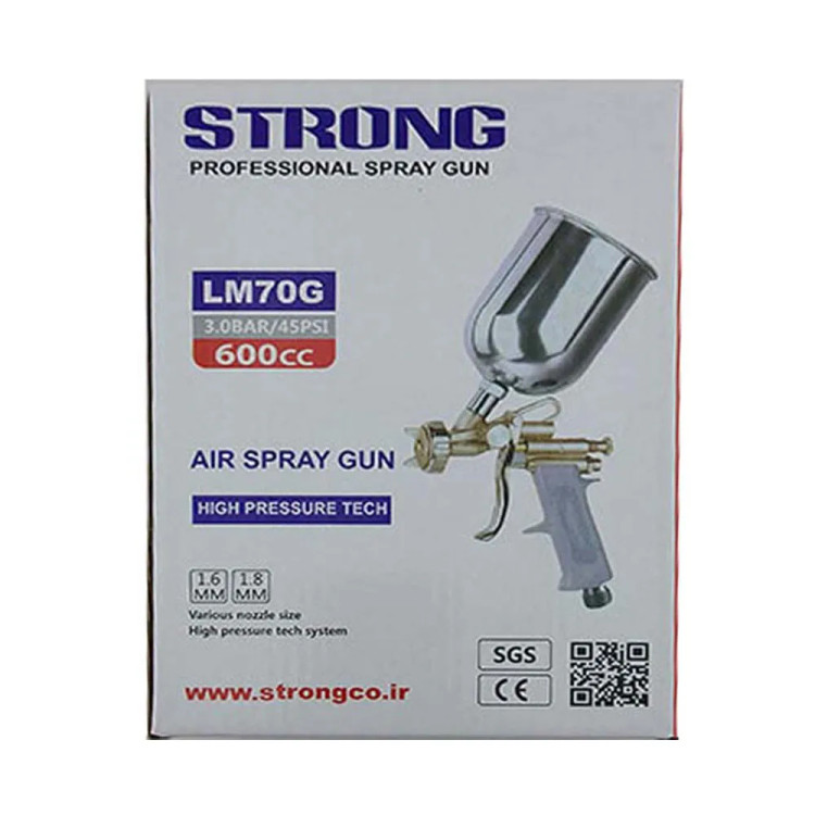 پیستوله رنگ پاش استرانگ مدل LM70G وسیله ای است برای اسپری کردن پوشش رنگ روی یک سطح به وسیله هوا، استفاده از پیستوله رنگ پاش بهترین روش جهت رنگ آمیزی سطوح می باشد. این پیستوله دارای مخزن استیل و طرح استرو میباشد. حجم مخزن این محصول 600 سی سی و دارای سوزن قابل تنظیم میباشد. پیستوله ها از نظر ساختاری دارای اجزای متعددی می باشند که عبارتند از : مخزن رنگ : وظیفه نگهداری رنگ را به عهده دارد و از طریق لوله به اسپری متصل است. ماشه پیستوله : کلیدی که باعث کنترل کردن توزیع هوا و رنگ می شود. سرپوش پاشش : بخشی از پیستوله که هوای فشرده را به سمت نازل هدایت میکند. نازل : قطعه ای است که با باز شدن آن ، رنگ جریان پیدا میکند و به سمت بیرون هدایت می شود. رابط شلنگ هوا : بخشی از پیستوله می باشد که از طریق شلنگ منعطف به کمپرسور متصل شده است و هوای فشرده شده را به داخل بدنه پیستوله هدایت می کند. پیچ تنظیم سیال : از این پیچ برای تعیین مقدار رنگ پخش شده توسط نازل استفاده می شود. پیچ تنظیم پاشش : از این پیچ برای کنترل و تنظیم حجم هوای فشرده شده به داخل ایرکپ استفاده می شود که به وسیله آن میتوان سایز و شکل پاشش رنگ را تغیر داد. پیستوله رنگ پاش استرانگ مدل LM70G برای کارکرد خود نیاز به کمپرسور باد دارد. پیستوله بادی یا رنگپاش پنوماتیکی به دو دسته حرفه ای و خانگی تقسیم میشوند. رنگ پاش بادی را باید بر اساس دقت پاشش، حداکثر فشار عملکرد و غلظت رنگ انتخاب و همچنین هنگام خرید رنگ پاش به جنس بدنه و نازل توجه کنید. استفاده از فولاد ضد زنگ در تولید این قطعات باعث افزایش طول عمر پیستوله میشود. این پیستوله با دو نازل 1/6 و 1/8 تولید می شود ( هر دو مدل در دیجی کالا موجود است ) معمولا نازل 1٫6 میلیمتر برای سطوح فلزی و نازل 1٫8 میلیمتری برای مصارف چوبی و صنعتی و ساختمانی ( حتی پاشش رنگ پلاستیک ) کاربرد دارند.