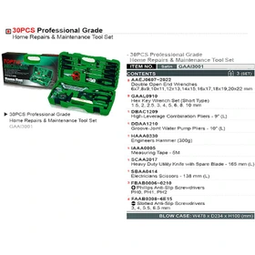 - پیچ گوشتی دوسو : ۴ عدد - پیچ گوشتی چهارسو : ۳ عدد - انبردست همه کاره - قیچی همه کاره الکترونیکی - آچار دوسرتخت : ۸ عدد - کاتر موکت بر ذوزنقه ای - چکش ۳۰۰ گرم - انبر کلاغی - متر ۵ متری - آچار آلن : ۹ عدد