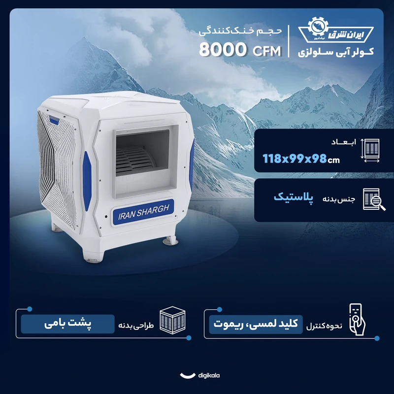 کولر آبی سلولزی 8000 ایران شرق مدل 85P یک دستگاه قدرتمند و مناسب فضاهای بزرگ است که با حجم خنککنندگی ۸۰۰۰ CFM میتواند هوای خنک و یکنواختی را در محیطهای بالای ۱۲۰ متر مربع ایجاد کند. طراحی پشتبامی این دستگاه برای نصب ثابت و استفاده طولانیمدت در منازل، فروشگاهها و محیطهای کاری مناسب است. بدنه پلاستیکی مقاوم در برابر رطوبت و نور خورشید، دوام کولر را افزایش میدهد و ابعاد ۹۹ × ۹۹ × ۱۱۸ سانتیمتری امکان قرارگیری مناسب روی پشتبام را فراهم میکند. گرید انرژی A نیز نشاندهنده مصرف بهینه و عملکرد اقتصادی این مدل است. در بخش فنی، کولر آبی سلولزی 8000 ایران شرق مدل 85P از پوشالهای سلولزی با قابلیت نصب فیلتر گرد و غبار بهره میبرد که باعث تولید هوای پاکتر و کاهش ورود آلودگی به محیط میشود. استفاده از سلولز موجب جذب یکنواختتر آب، کاهش مصرف و افزایش راندمان خنککنندگی در مقایسه با پوشالهای معمولی است. سیستم فلوتر مکانیکی سطح آب را بهطور ثابت نگه میدارد و اتصال مستقیم کولر به آب شهری، عملکرد بدون دردسر و بدون نیاز به پر کردن دستی مخزن را فراهم میکند. موتور تکفاز با ولتاژ ۲۲۰ تا ۲۴۰ ولت نیز عملکرد پایدار و سازگار با برق خانگی ارائه میدهد. در بخش کنترل، کولر آبی سلولزی 8000 ایران شرق مدل 85P به ریموت کنترل، کلیدهای لمسی و نمایشگر دیجیتال مجهز است که مدیریت سرعت باد، حالتهای کاری و میزان آبرسانی را سادهتر میکند. این سبک کنترل مدرن، تجربه کاربری راحتتری نسبت به سیستمهای قدیمی فراهم میسازد و امکان تنظیم دستگاه از راه دور را نیز فراهم میکند. اقلام همراه شامل ریموت کنترل، دفترچه راهنما و پایه نصب هستند. در مجموع، این مدل گزینهای مناسب برای فضاهای بزرگ، کاربرانی با نیاز خنککنندگی گسترده و کسانی است که دوام، راندمان بالا و کنترل هوشمند را بهطور همزمان میخواهند.