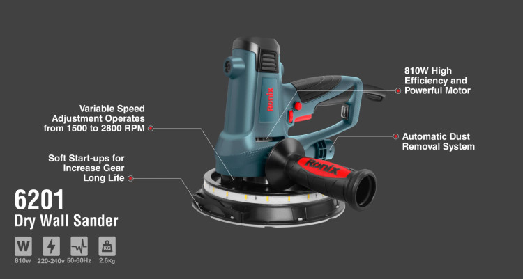 دستگاه سنبادهزن دیواری 810 وات رونیکس مدل 6201، برای سنبادهزنی سقف و دیوار بهترین انتخاب است. با کمک این ابزار، سطوح یکنواخت و صافی را روی سطح ایجاد کنید که آماده رنگکاری نهایی هستند.