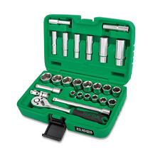 سوکت بکس های کوتاه: 14 عدد سوکت بکس شش پر فلنک و کوتاه با طول 28 و 30 میلیمتر / در سایزهای 24 – 22 – 21 – 19 – 18 – 17 – 16 – 15 – 14 – 13 – 12 – 11 – 10 – 8 میلیمتر