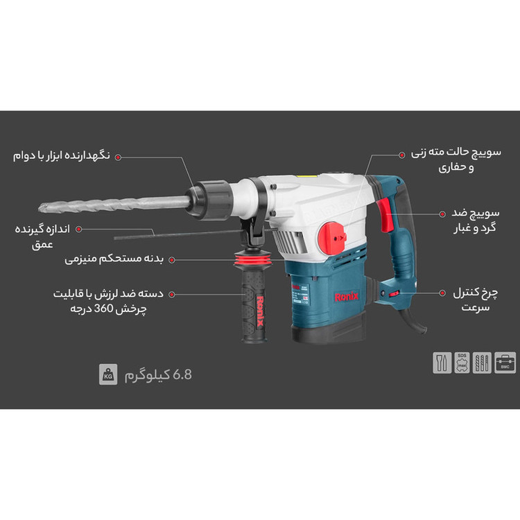 چنانچه به دنبال دریل بتن کن هستید، میتوانید محصول شرکت «Ronix» «رونیکس» را انتخاب کنید. این دریل بتن کن تحت عنوان مدل (2740) به بازار عرضه شده است. منبع تغذیه این ابزار برق بوده، ولتاژ آن 220 ولت و دارای ابزارگیر پنج شیار است. اقلام همراه این دریل بتن کن عبارتند از: کیف، دفترچه راهنما، دو عدد مته چکشی و سه عدد مته چرخشی، گریس، دسته جانبی، میله عمق سنج، درپوش غبارگیر و آچار مخصوص. وزن این ابزار 6.8 کیلوگرم است. سرعت گردش آزاد این محصول 450 دور بر دقیقه بوده، نرخ ضربه آن 2800 ضربه در دقیقه و توان آن 1250 وات است. حداکثر قطر سوراخکاری در مصالح این محصول 40 میلیمتر است و قابلیت وارد آوردن 10 ژول انرژی در هر ضربه را دارد. این دستگاه به هنگام کار نیروی بسیار زیادی را وارد میکند و دارای استاندارد ISO 9001: 2008 بوده و از عملکرد بسیار خوبی برخوردار است.