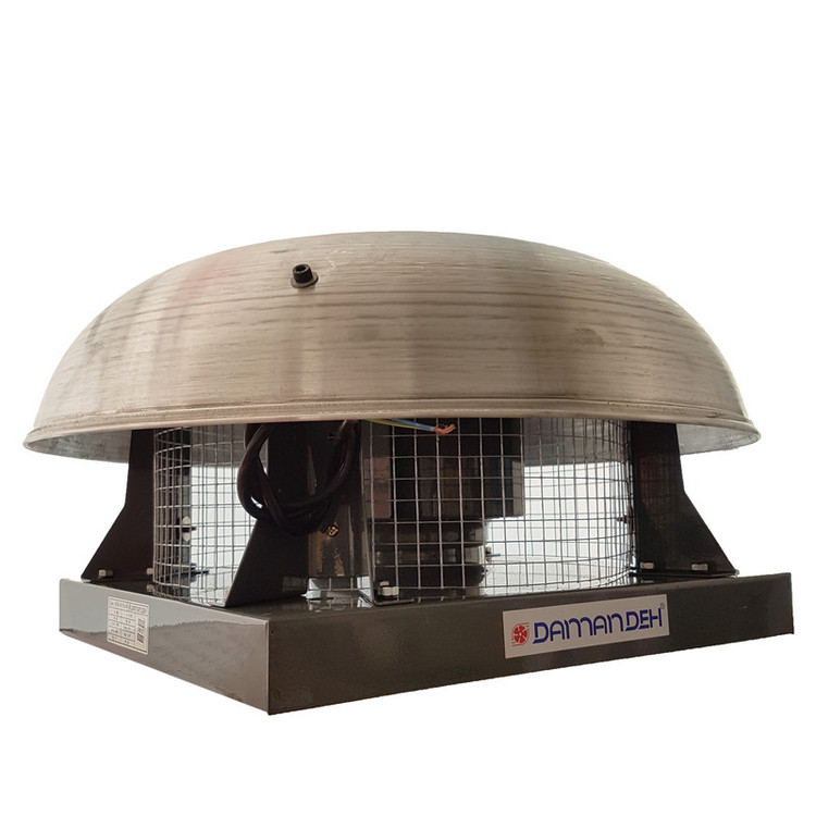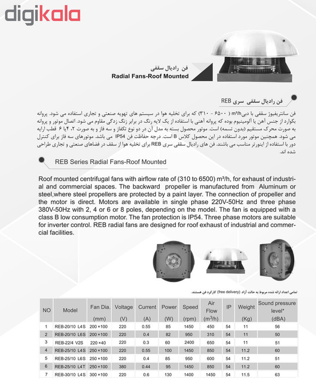هواکش سانتریفیوژ از پرکاربردترین سیستم های تهویه در مکان های عمومی مانند: ادارات، مرغداری ها، گلخانه ها، بیمارستان ها و ... است. هواکش های سانتریفیوژ با توجه به پروانه خمیده رو به عقبی که دارند به عنوان فن اگزا مورد استفاده قرار می گیرند. در این نوع هواکش های سقفی از قسمت زیرین دستگاه هوا وارد شده و از دیواره های کناری خارج می شود. الکتروموتور این نوع هواکش ها در قاب محافظ شده ای تعبیه شده است که سبب می شود در شرایط بد آب و هوایی هواکش دچار مشکلی نشود. این هواکش ها نیز در ابعاد و ظرفیت های مختلفی تولید شده اند که می توانید از بین آنها انتخاب خوبی داشته باشید. هواکش سقفی دمنده یکی از انواع هواکش های سقفی است که دارای استاندارد IP54 بوده و به همین دلیل می توانید از آن در محیطهای مرطوب و پر از گردوخاک استفاده کنید. ولتاژ این هواکش تک فاز 220V بوده و شدت جریان آن 0.55 آمپر است. توان این مدل هواکش دمنده 100W و دور موتور آن 1400 دور در دقیقه است. وزن هواکش سقفی رادیال برابر 11.2 کیلوگرم بوده و رنج هوادهی آن 850 متر مکعب بر ساعت می باشد. هوای ورودی به موازات محور گردش پروانه وارد فن شده و با حرکت شعاعی به سمت پروانه و نوک بالک ها حرکت می کند. همزمان با این حرکت، جریان هوا مقداری انرژی جنبشی دریافت می کند که افزایش فشار استاتیک را همزمان با آهسته شدن حرکت جریان هوا قبل از ورود به مسیر تخلیه را در پی دارد. فن های سانتریفیوژ قابلیت عملکرد در مکان هایی که جریان هوا کثیف و دارای ناخالصی یا دارای دمای بالایی را دارند. علاوه بر آن این فن ها توانایی غلبه بر افت فشار استاتیک بالا در سیستم های کانال کشی شده را دارند و این نکته از مهم ترین ویژگی های آنهاست. این هواکش که در این صفحه به شما پیشنهاد می دهیم یک هواکش سقفی است که ساختار فلزی مستحکمی دارد.