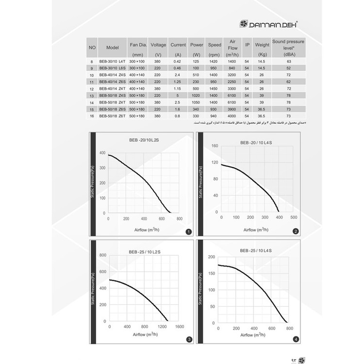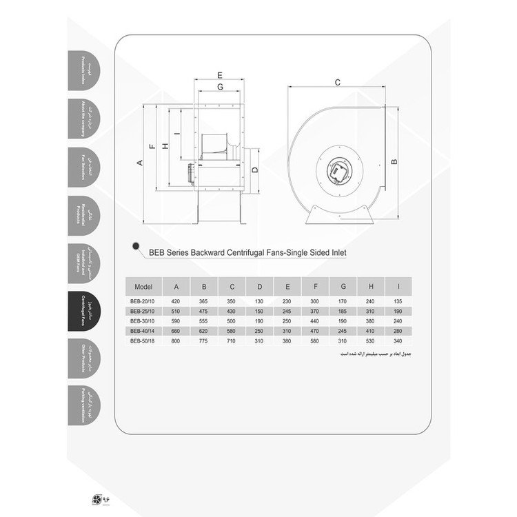 سانترفیوژ یک طرفه بکوارد دمنده با ظرفیت هوادهی ۴۰۰ تا ۶۲۰۰ مترمکعب بر ساعت دارای مقطع خروجی مستطیلی است. برای نصب در سیستم های تهویه صنعتی و تجاری استفاده می شود. چرخ فن و حلزونی محصول از آهنی گالوانیزه بوده که در برابر زنگ زدگی مقاوم است. اتصال موتور و چرخ فن به صورت محرک مستقیم (بدون تسمه) است. موتور محصول بسته به مدل آن در دو نوع تکفاز و سه فاز و به صورت ۶،۴ یا ۸ قطب ارایه می شود. همچنین موتور مورد استفاده سانترفیوژ یک طرفه بکوارد دمنده کلاس B است. برای کار در محیط هایی با دمای تا ۴۰ درجه سانتی گراد مناسب است. درجه حفاظت فن IP54 می باشد. موتور های سه فاز برای کنترل دور با استفاده از اینورتر مناسب می باشند. فن های سری BEB برای تخلیه هوا از فضاهای صنعتی و تجاری، تخلیه از کانال ها، هودهای رستورانی و صنعتی و یوتیلیتی طراحی شده اند.