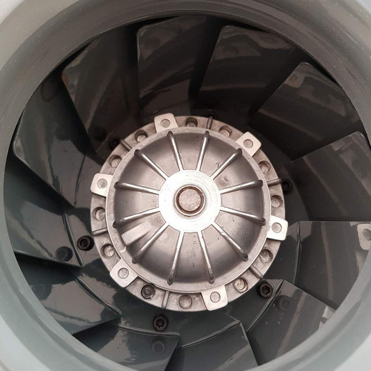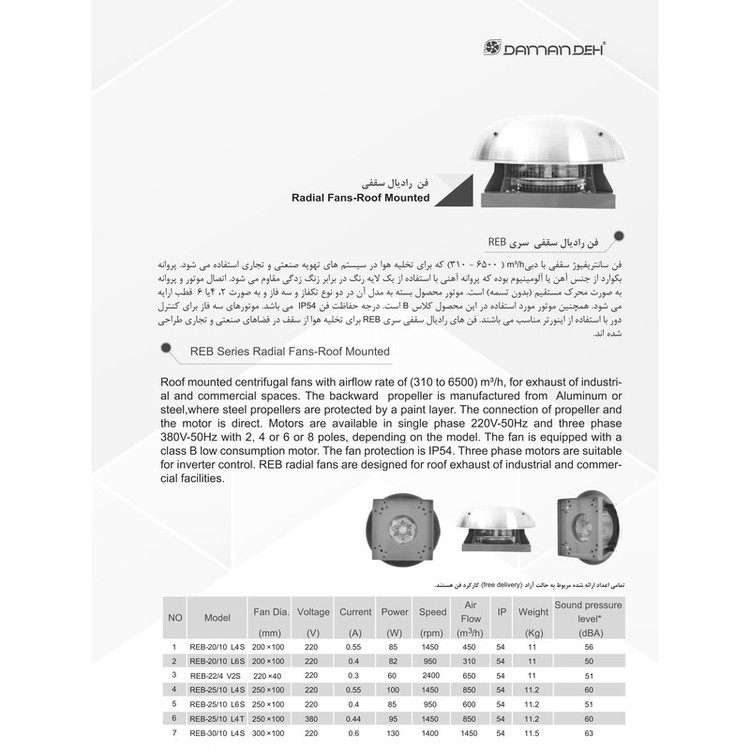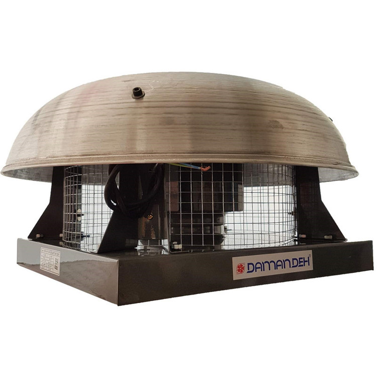 هواکش سانتریفیوژ از پرکاربردترین سیستم های تهویه در مکان های عمومی مانند: ادارات، مرغداری ها، گلخانه ها، بیمارستان ها و ... است. هواکش های سانتریفیوژ با توجه به پروانه خمیده رو به عقبی که دارند به عنوان فن اگزا مورد استفاده قرار می گیرند. در این نوع هواکش های سقفی از قسمت زیرین دستگاه هوا وارد شده و از دیواره های کناری خارج می شود. الکتروموتور این نوع هواکش ها در قاب محافظ شده ای تعبیه شده است که سبب می شود در شرایط بد آب و هوایی هواکش دچار مشکلی نشود. این هواکش ها نیز در ابعاد و ظرفیت های مختلفی تولید شده اند که می توانید از بین آنها انتخاب خوبی داشته باشید. هواکش سقفی دمنده یکی از انواع هواکش های سقفی است که دارای استاندارد IP54 بوده و به همین دلیل می توانید از آن در محیطهای مرطوب و پر از گردوخاک استفاده کنید. ولتاژ این هواکش تک فاز 220V بوده و شدت جریان آن 0.6 آمپر است. توان این مدل هواکش دمنده 130W و دور موتور آن 1400 دور در دقیقه است. وزن هواکش سقفی رادیال برابر 11.5 کیلوگرم بوده و رنج هوادهی آن 1450 متر مکعب بر ساعت می باشد. هوای ورودی به موازات محور گردش پروانه وارد فن شده و با حرکت شعاعی به سمت پروانه و نوک بالک ها حرکت می کند. همزمان با این حرکت، جریان هوا مقداری انرژی جنبشی دریافت می کند که افزایش فشار استاتیک را همزمان با آهسته شدن حرکت جریان هوا قبل از ورود به مسیر تخلیه را در پی دارد. فن های سانتریفیوژ قابلیت عملکرد در مکان هایی که جریان هوا کثیف و دارای ناخالصی یا دارای دمای بالایی را دارند. علاوه بر آن این فن ها توانایی غلبه بر افت فشار استاتیک بالا در سیستم های کانال کشی شده را دارند و این نکته از مهم ترین ویژگی های آنهاست. این هواکش که در این صفحه به شما پیشنهاد می دهیم یک هواکش سقفی است که ساختار فلزی مستحکمی دارد.