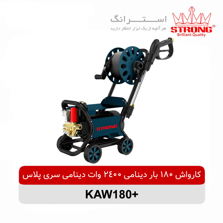 کارواش دینامی 180 بار 2400 وات استرانگ مدل KAW180 Plus از سری پلاس کارواش های حرفه ای و پر قدرت شرکت استرانگ میباشد، این کارواش با برق 220 ولت کار میکند و قابلیت کار با آب گرم تا دمای 50 درجه را دارا میباشد. این کارواش قابلیت کنترل فشار آب خروجی (فشار شکن) را دارا میباشد که برای کنترل میزان خروجی آب متناسب با نیاز هر فرد قابل تنظیم است. این کارواش دارای کلت و لانس دوحالته با قابلیت کوتاه و بلند شدن جهت شرایط خاص و شیلنگ منجید دار 10 متری همراه با جمع کن شیلنگ نیز میباشد.